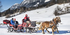 Ebenso kann der Urlaubstag in den Tiroler Bergen seinen perfekten Ausklang bei einer romantischen Pferdekutschenfahrt in der Abenddämmerung finden, wenn man unter warmen Felldecken gemütlich die Schneeluft atmet und einen als einziges Geräusch die Pferdehufe begleiten.